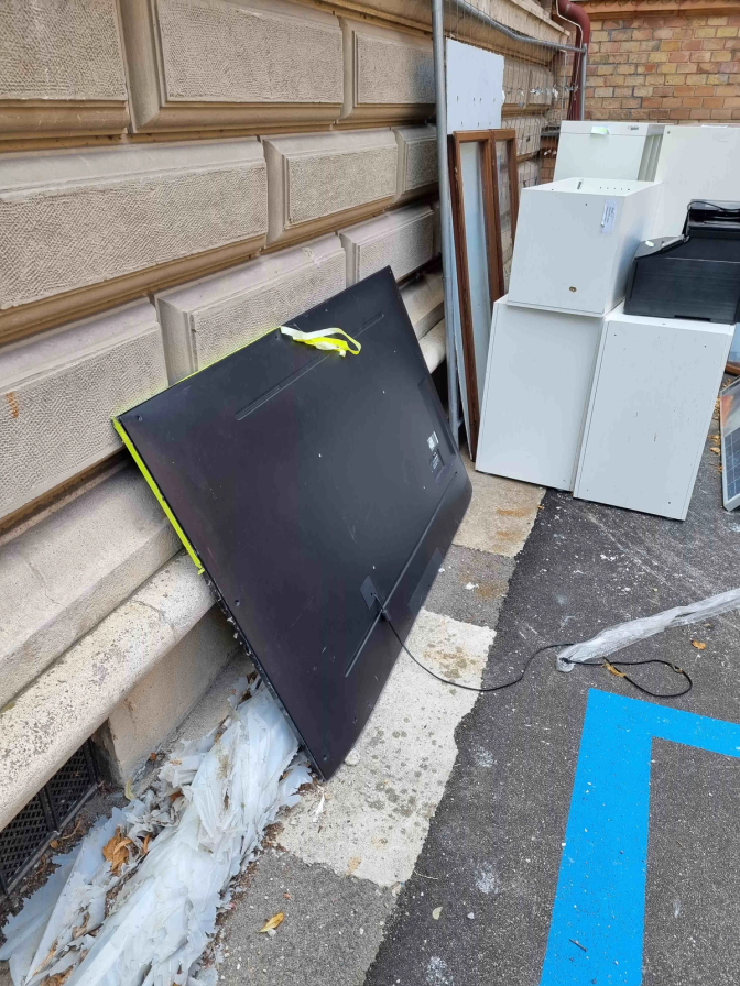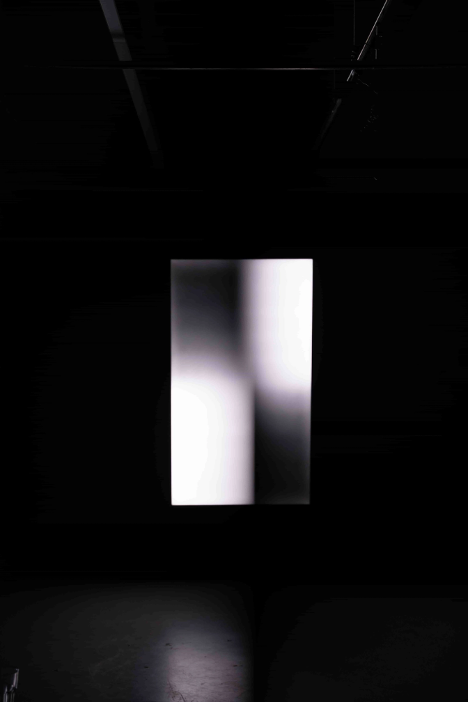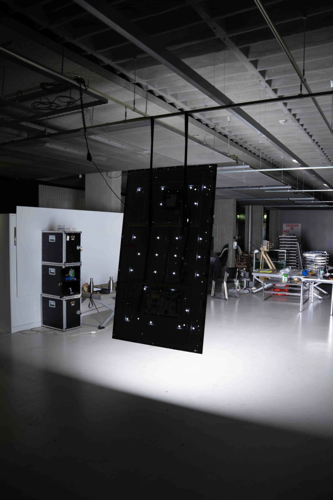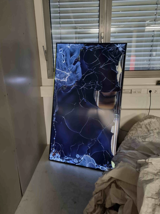This 82-inch TV was salvaged from a dumpster. It was deconstructed to remove the crystal layer and all other unnecessary parts (speakers, LCD drivers, …). The last step was to rewire the electronics to only power the backlight.