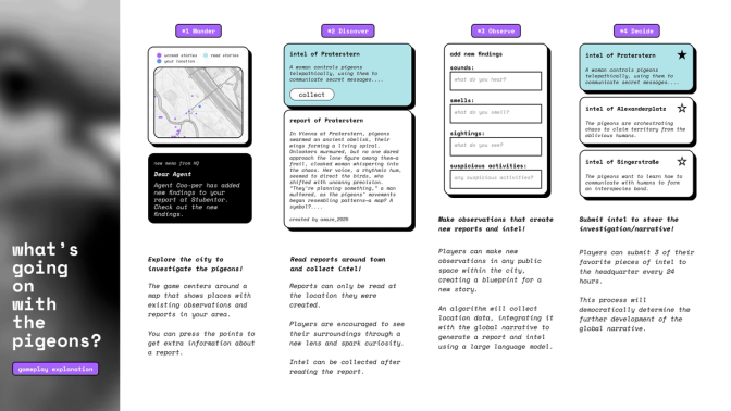Players navigate the game through a dynamic map, uncovering reports and intel tied to real-world locations. Reports can only be accessed by visiting the places where they were created, encouraging exploration and curiosity. After investigating a location, players can collect associated intel to deepen their investigation. New reports are generated by making observations in public spaces, with location data and an algorithm weaving them into the global narrative. Observations can also be made at exisiting reports to continue the local narrative. Players can submit up to 3 favorite theories to headquarters every 24 hours, influencing the collective story development through democratic decision-making. Engage, explore, and shape the narrative!